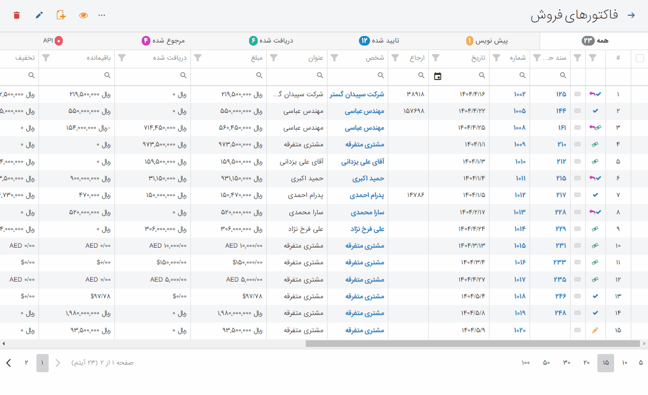 - اضافه شدن ستون عنوان و نام شخص در لیست فاکتورها