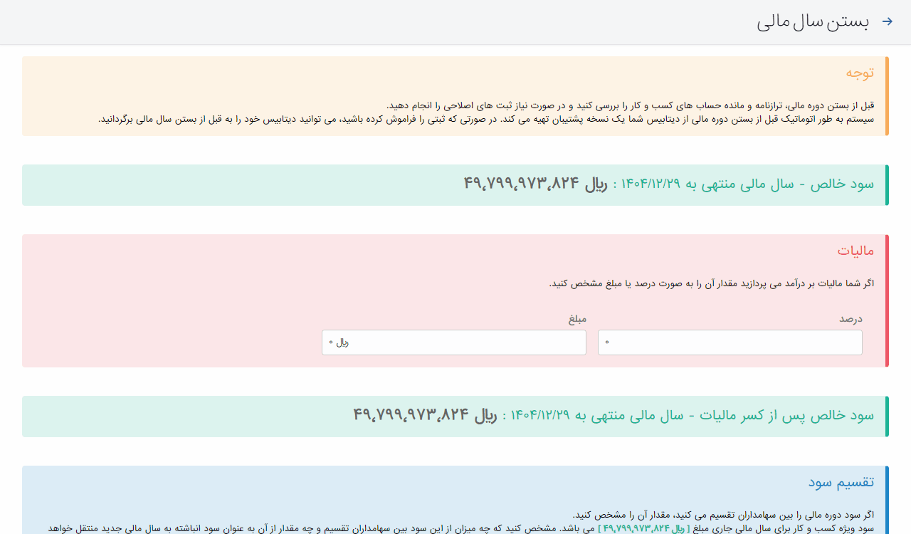 - امکان تعیین حساب ثبت مالیات عملکرد در هنگام بستن سال مالی