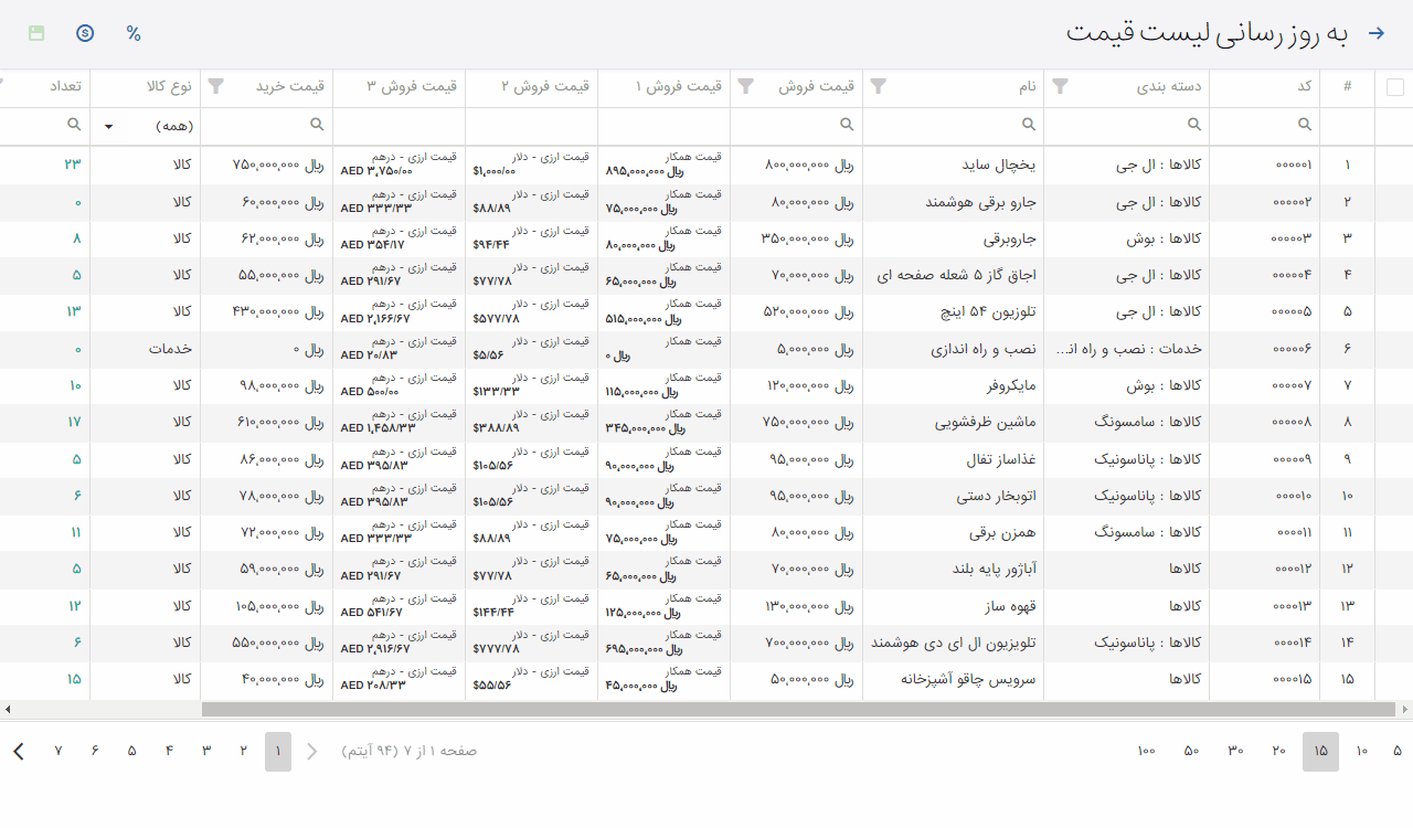- امکان تغییر و بروزرسانی گروهی قیمت کالاها و خدمات بصورت درصدی یا مبلغ ثابت