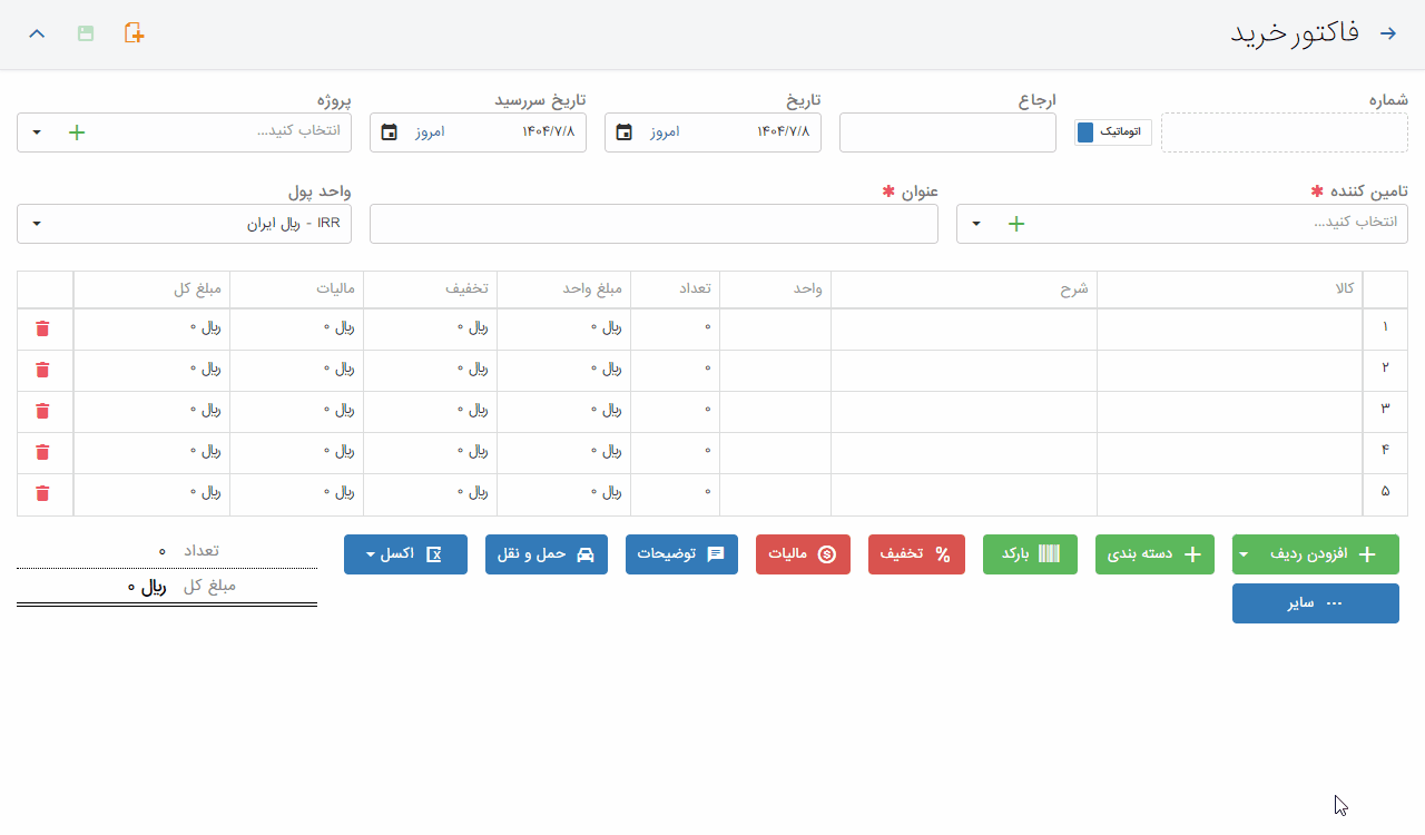 - ثبت مالیات خرید و فروش کالا در صورت مشمول بودن