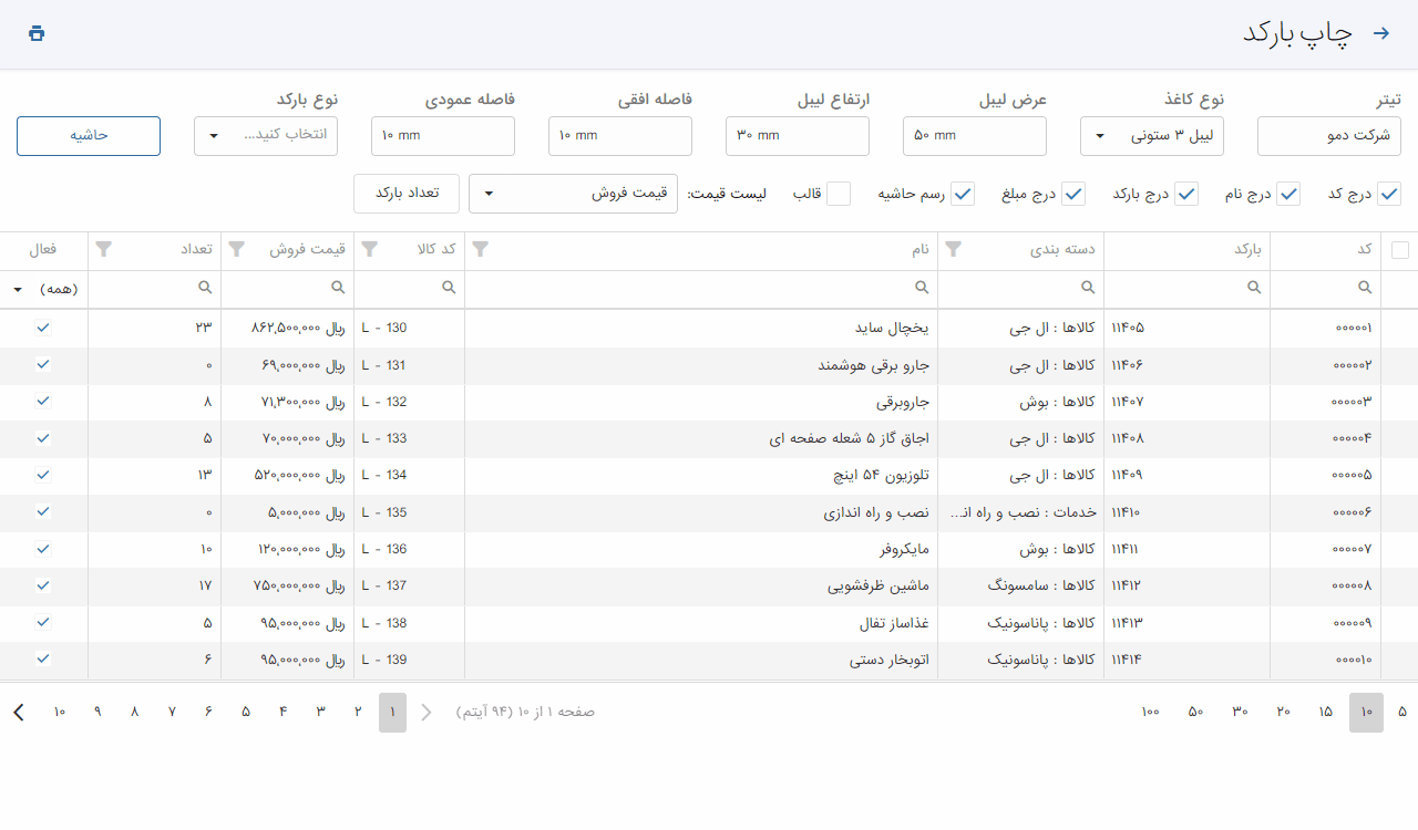 - امکان ثبت کلی کالاها در صفحه چاپ بارکد تعدادی