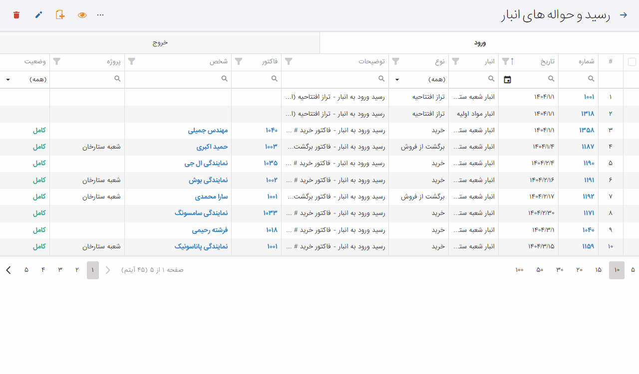 - امکان فعال/غیرفعال کردن اشخاص، کالا، بانک، انبار و...