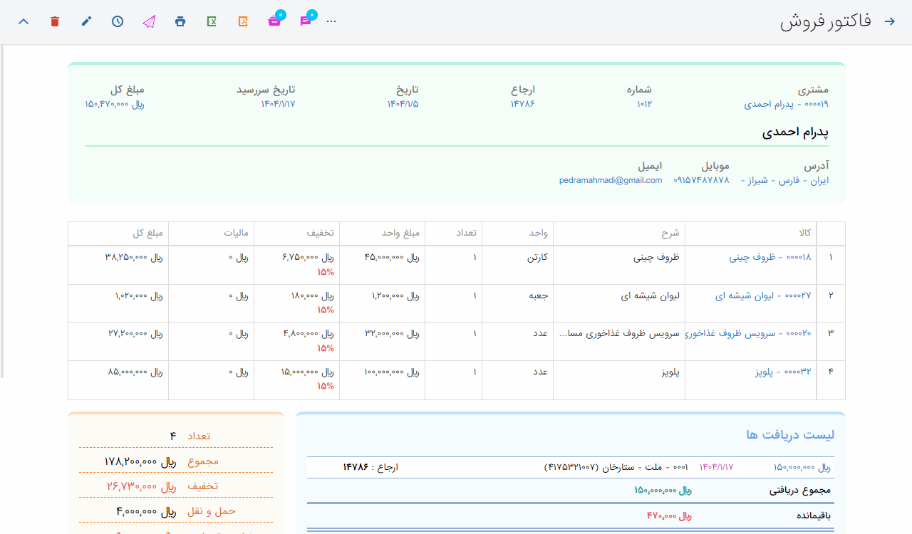 - امکان صدور فاکتور آنلاین و دریافت وجه فاکتور بصورت آنلاین از طریق درگاه بانکی