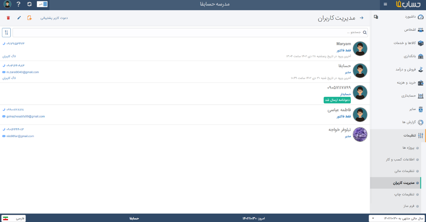 به تعداد کارکنان خود می توانید در نرم افزار حسابداری آنلاین حسابفا کاربر با سطح دسترسی مشخص تعریف کنید. سطوح دسترسی تا جزئی ترین بخش ها قابل تنظیم است. کاربران شما با نام کاربری و کلمه عبور خود می توانند از هر دستگاه متصل به اینترنت به نرم افزار حسابداری مجموعه شما متصل شوند.