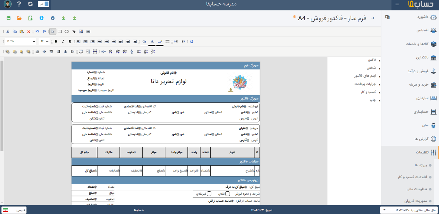 در نرم افزار حسابداری حسابفا با کمک فرم ساز حرفه ای، کاربران می توانند قالب های سفارشی، متنوع و زیبا برای فاکتور خود طراحی کنند سپس از این قالب ها برای چاپ فاکتور استفاده نمایند. امکان طراحی قالب فاکتور این امکان را در اختیار حسابداران قرار می دهد که برای فاکتورهای رسمی، غیر رسمی و پیش فاکتورهای خود چندین فرم مجزا در دست داشته باشند.